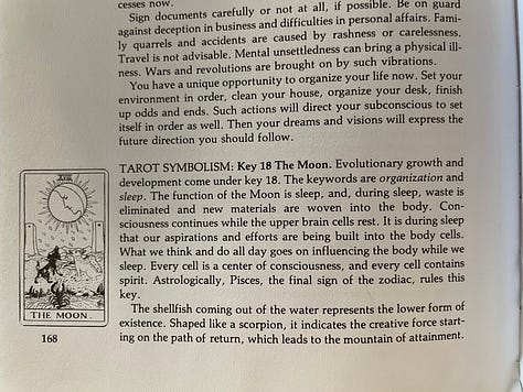 The Moon exposes the Hidden and gets us in tune with our Shadow side in a gentle and non-judgemental way. These are the very things that can hold us back from the prize The Star (Aquarius) is attempting to get us to claim. Deception, unforeseen perils, subtlety, mystery, instinct.
